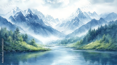 Serene river flows through misty, snow-capped mountains.