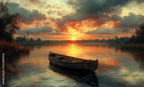 Serene River Landscape at Dusk with Rowboat and Windmills in Romanticism Style