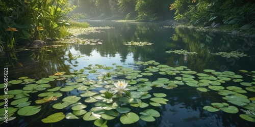 serene river landscape with lily flowers and green leaves floating on the surface, environment, peaceful