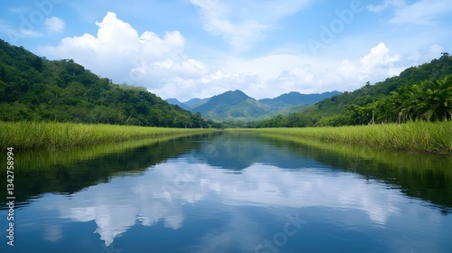 Serene River Reflection Surrounded by Lush Green Mountainscape