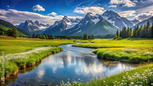Serene River Winding Through Verdant Meadow, Majestic Mountain Peaks in the Background