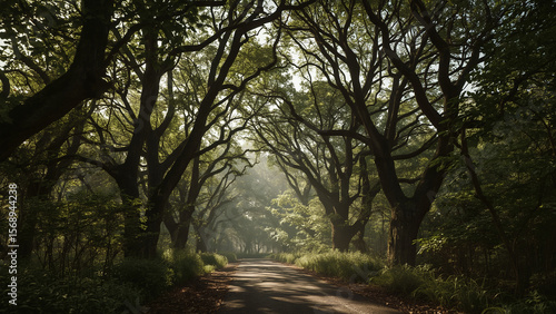 Serene Road Through a Lush Green Forest Tunnel with Sunlit Canopies and Mystical Fog, Perfect for Nature and Travel Themes
