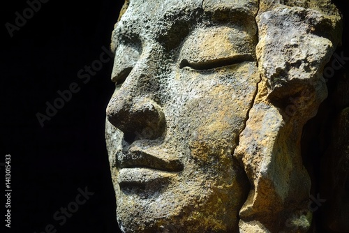 Serene Rock Buddha Statue on Pure Black Background with Intricate Carving Details