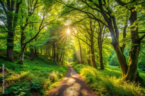 Serene rural footpath winds its way through a lush, vibrant wild foliage woodland, surrounded by dense greenery and dappled sunlight filtering through the trees.