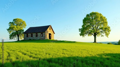 Serene Rural Landscape Featuring a Stone Structure and Lush Greenery Under a Tranquil Sky