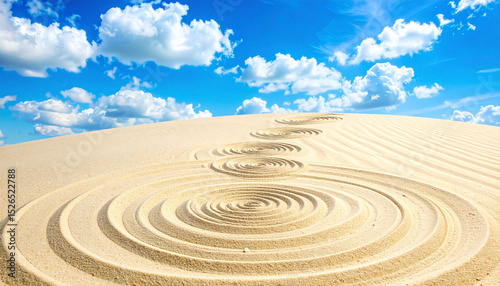 Serene Sand Dune Landscape with Circular Patterns under a Bright Blue Sky A Peaceful Zen Garden Scene