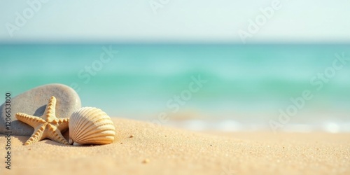 Serene Seashore Scene Starfish, Seashell, and Smooth Stone Resting on Golden Sand with a Blurred Turquoise Ocean Background
