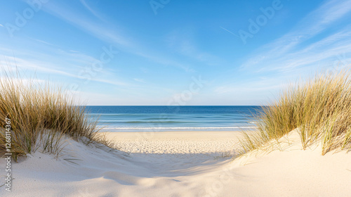 Serene Seashore Tranquility Path Through Dune Grass Under Azure Sky Coastal Horizon Splendor