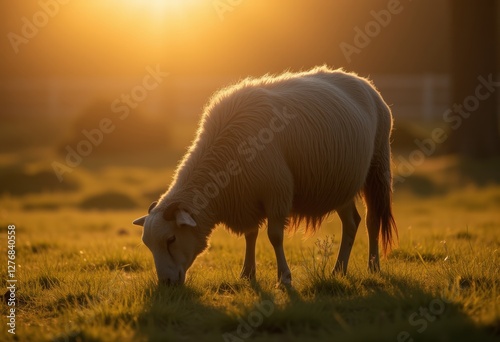 Serene Sheep Grazing in a Misty Field During a Tranquil Sunrise, Illuminated by Soft Orange and Pink Hues in the Sky