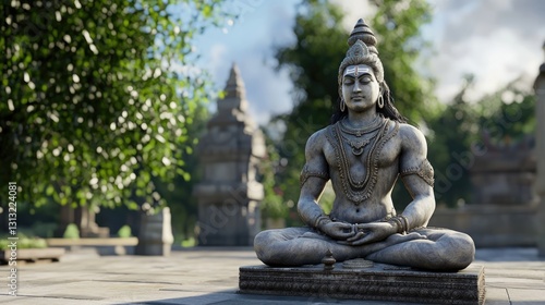 Serene shiva statue ancient temple grounds digital art lush garden close-up spiritual reflection