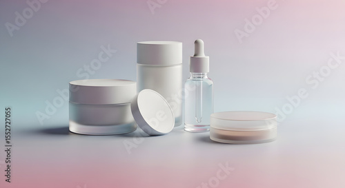 Serene Skincare: Minimalist Cosmetic Jars & Dropper Bottle on Gradient Background