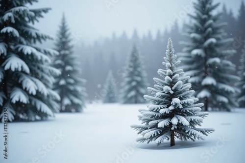 Serene snowy forest with pine trees on a winter day with gently falling snowflakes.