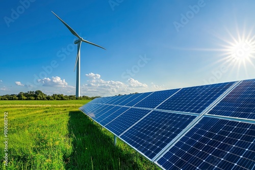 serene solar farm and towering wind turbine stand in lush green fields against a pristine blue sky, for clean energy, sustainable future, eco-friendly and renewable energy concept, ai