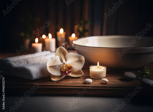 Serene spa setting: A wooden tray holds a white towel, orchid, candle, smooth stones, and a footbath. Warm candlelight illuminates the scene, promoting relaxation and tranquility.