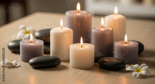Serene Spa Setting: Lit Candles and Smooth Stones