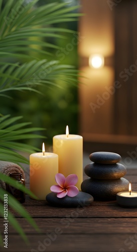 Serene spa setting with candles, stones, and orchid, ideal for product placement.