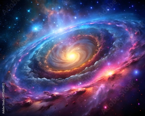 Serene Spiral Galaxy with Glowing Core Surrounded by Colorful Nebula and Stars background