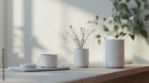 Serene Still Life White Minimalist Vases and Greenery Casting Shadows on Wall for Natural Calm Scene