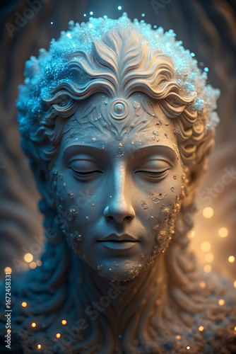 Serene Stone Sculpture of a Woman with Closed Eyes Adorned with Light and Texture in a Dreamlike Setting