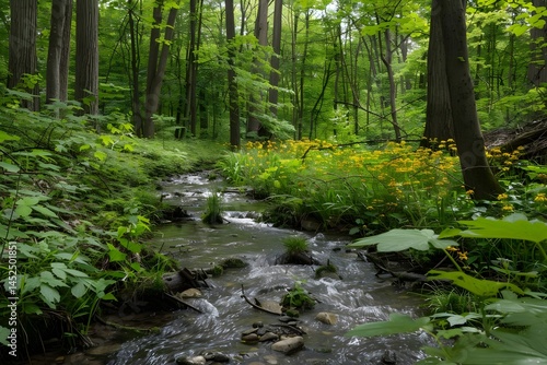 Serene Stream Flows Gently Through Lush Forest, Golden Flowers Blooming Abundantly Along Banks, Tranquil Nature Scene, Peaceful Sounds of Water, Vibrant Greenery, Picturesque Woodland, Natural Beauty,