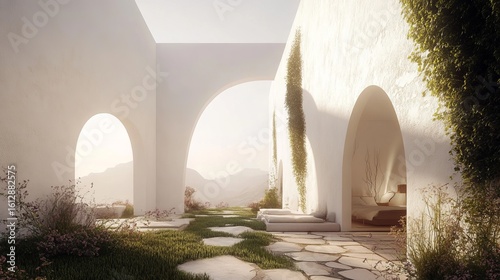 Serene sunlit courtyard, featuring arches, stone paths, lush greenery, and a glimpse of the distant mountains