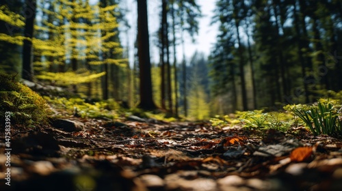 Serene Sunlit Forest Pathway with Lush Green Foliage and Gentle Sunlight Filtering Through Tree Canopy