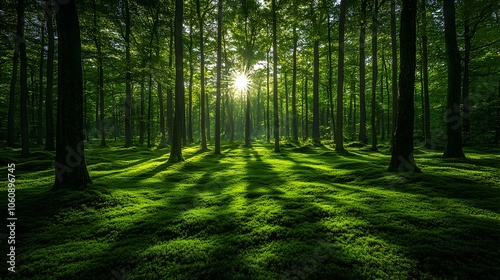 Serene Sunlit Forest with Dappled Lighting Creating a Magical Minimalist Atmosphere
