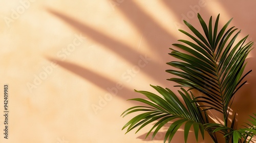 Serene Sunlit Palm Fronds Casting Intricate Shadows on a Soft Textured Wall, Warm Tropical Ambiance with Muted Pink and Beige Background, Delicate Play of Light and Shadow in a Peaceful, Sun-Drenched