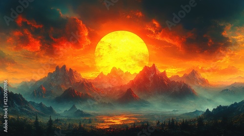 Serene Sunrise: Majestic Mountain Range Oil Painting with Minimal Noise