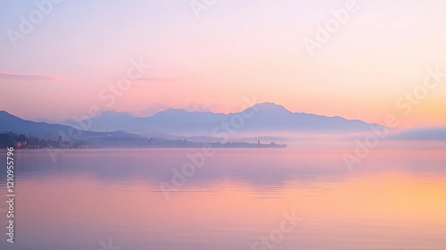 Serene sunrise over calm lake with mountain reflection.
