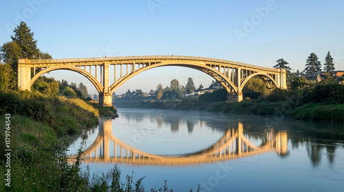 Serene Sunrise over the River Bridge: A Majestic Architectural Landscape