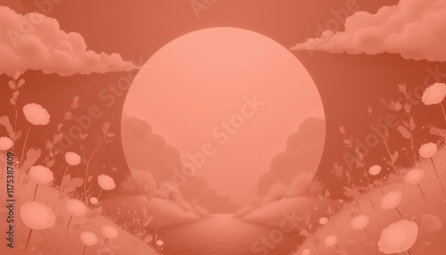 Serene Sunset Landscape: A Dreamlike River flows through a field of flowers under a large sun, creating a calming and peaceful atmosphere.