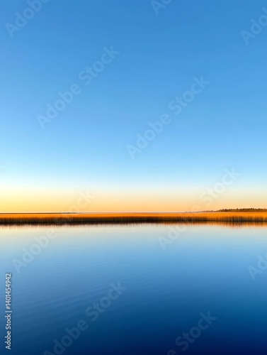 Serene Sunset Over Calm Water - Peaceful sunset scene featuring a calm body of water reflecting the sky and a distant shoreline. Tranquil and serene