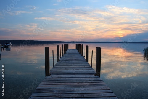 Serene Sunset Over Dock at Torch Lake, Michigan - A Tranquil Vacation Escape