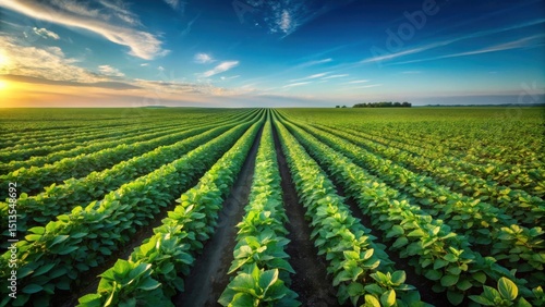 Serene Sunset Over Lush Green Rows of Cultivated Crops in a Vast Agricultural Field