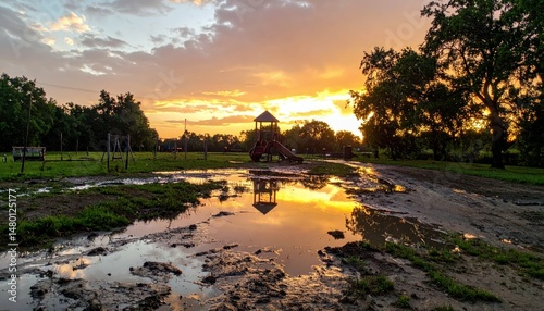 Serene Sunset Reflection Over Playground and Puddle in the Park