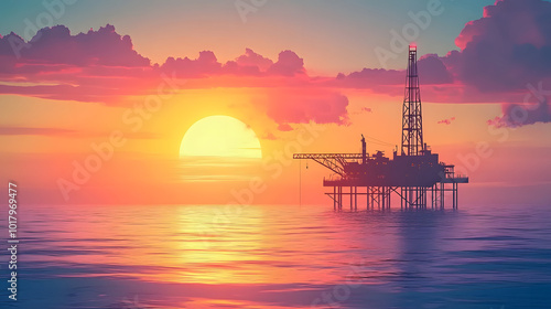 Serene Sunset View of Minimalist Oil Rig in Ocean - Flat Vector Illustration with Clean Design and Rich Colors