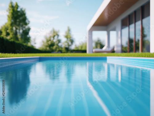 serene swimming pool with clear blue water, surrounded by lush green grass and modern architecture, creates tranquil outdoor space for relaxation