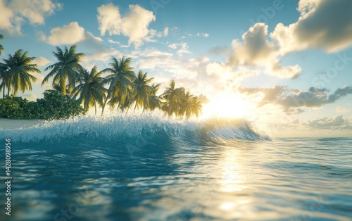 Serene Tropical Beach at Sunrise with Gentle Waves and Palm Trees Under a Colorful Sky