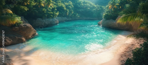 Serene tropical beach with crystal clear water surrounded by lush greenery and sandy shore ideal for vacation and relaxation