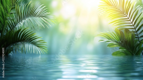 Serene tropical oasis with lush greenery and tranquil water reflection