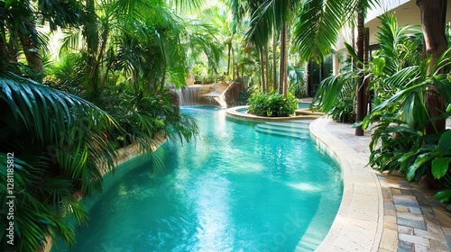 Serene Tropical Pool Oasis Lush Greenery Waterfall Relaxation
