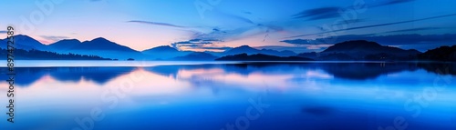 Serene Twilight: Blue Lake Reflections with Distant Mountains and Copy Space