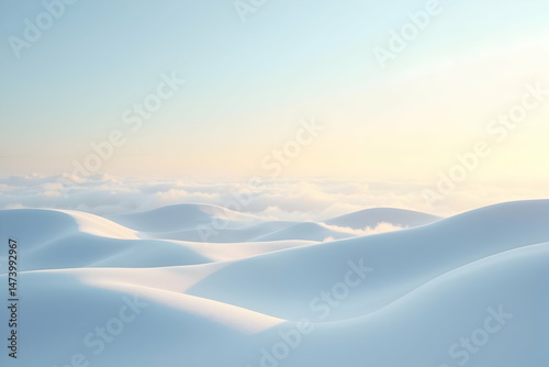 Serene vista of softly undulating snow hills and their gentle slopes bathed in the soft glow of a pastel colored sky creating a dreamy abstract landscape