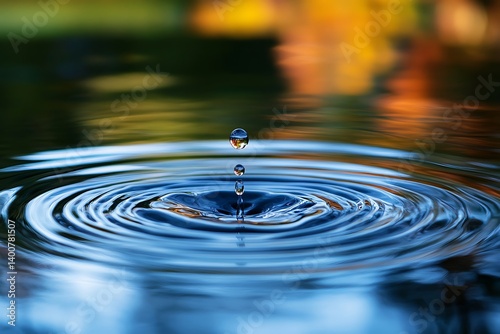 Serene Water Droplet Impact Creates Ripples in Blue Water Reflection of Blurred Tree
