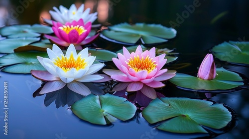 Serene Water Lilies in Bloom Pink White and Bud on Lily Pads