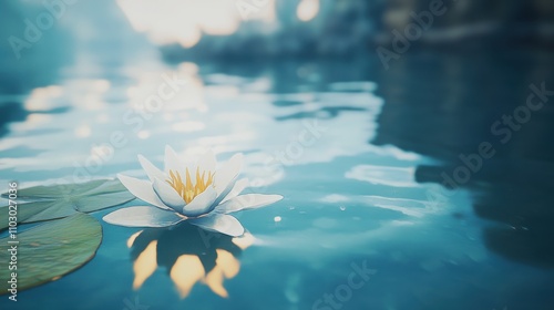 Serene Water Lily Blossom Floating Gracefully on Calm Blue Water Surface with Soft Reflections and Gentle Ripples in a Tranquil Natural Setting