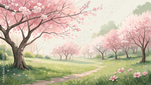 *"Serene Watercolor Cherry Orchard – Soft Pink & Green Blossom Background with Tranquil Nature Vibes + Copy Space"*