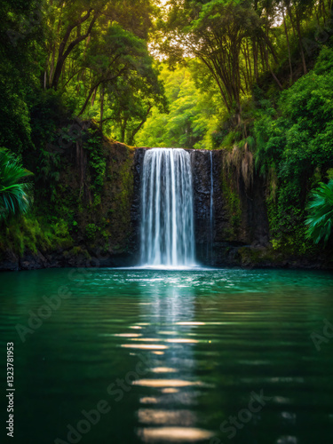 Serene Waterfall Cascading into Reflective Pool in Lush Green Forest Setting
