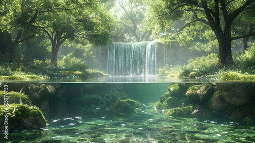 Serene Waterfall in Enchanting Forest with Lush Moss, Generative AI